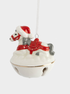 Игрушка елочная, 7 см, с колокольчиком, фарфор P, бело-красная, Лошадка на снегу, New year ANLAF-XI